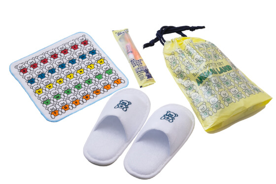 어린이에게는 무료로 어메니티 세트를 드리고 있습니다.(미니 핸드타올, 이닦기 세트, 슬리퍼)